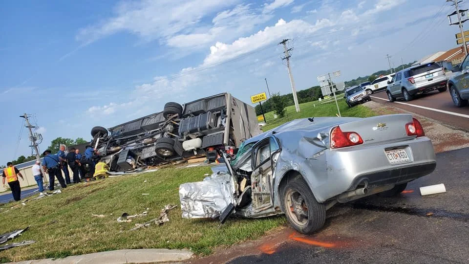 The driver of the RV, Dustin Leach, 36, of Kearney, attempted to improperly pass a car on PP Highway between Shoshone Drive and I-35 in Holt, but side-swiped a vehicle. The RV then rolled over.