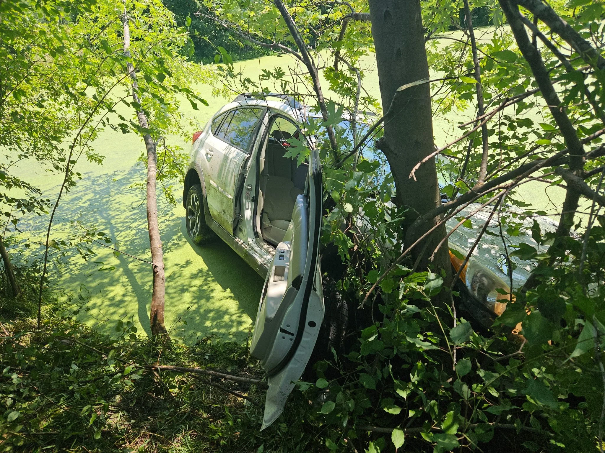 According to authorities, officers were dispatched to the scene after receiving reports of a vehicle that had left the roadway. Upon arrival, they found that the vehicle had struck a tree and was hanging over the water’s edge, with its occupants still inside.